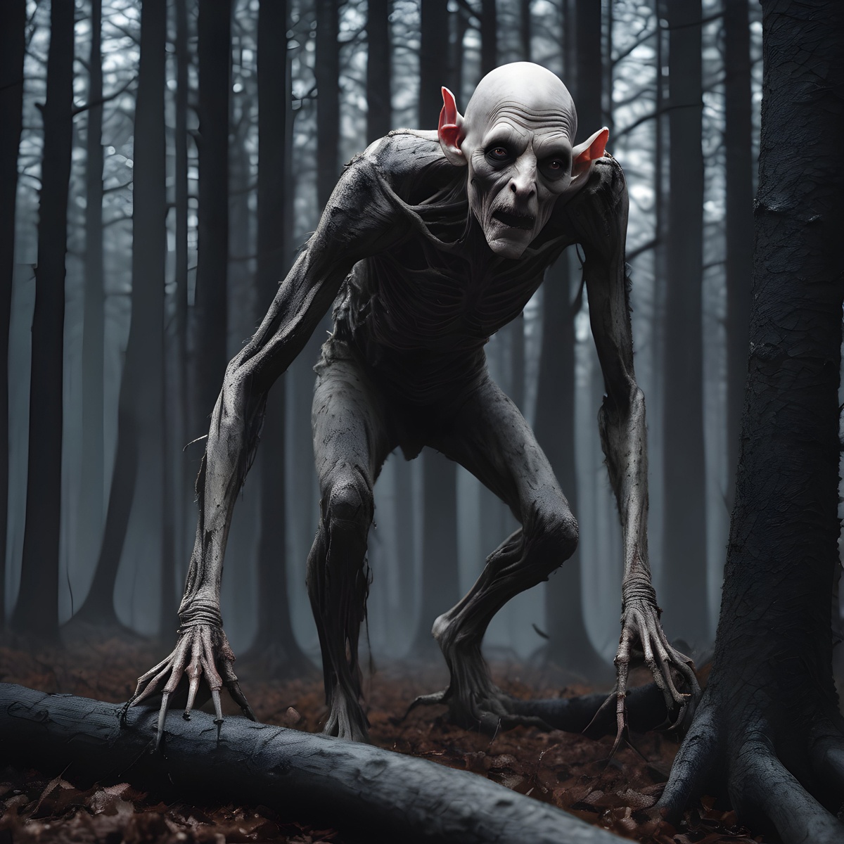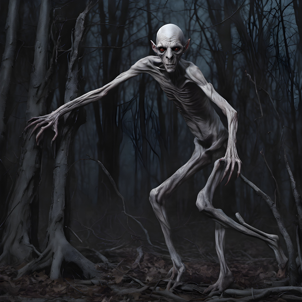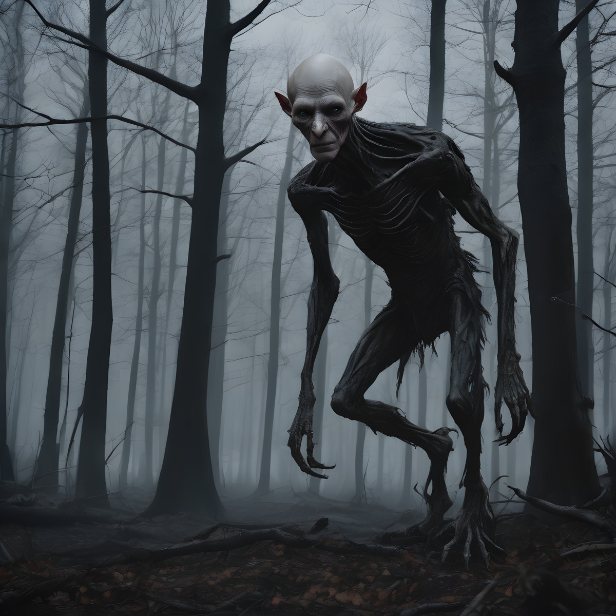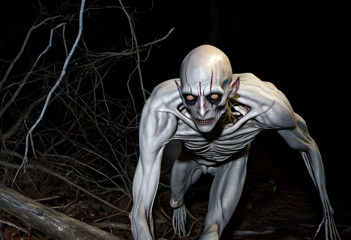 The Rake is described as a gaunt, humanoid creature with pale, hairless skin. Its eyes are large and dark, often reported as glowing in the dark. The creature's limbs are elongated, with fingers ending in sharp claws. These features contribute to its eerie and unsettling appearance.