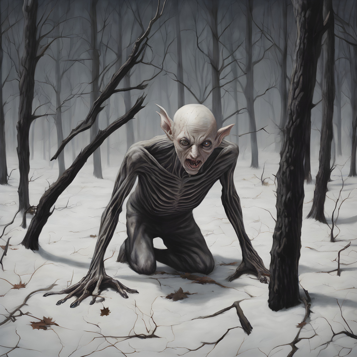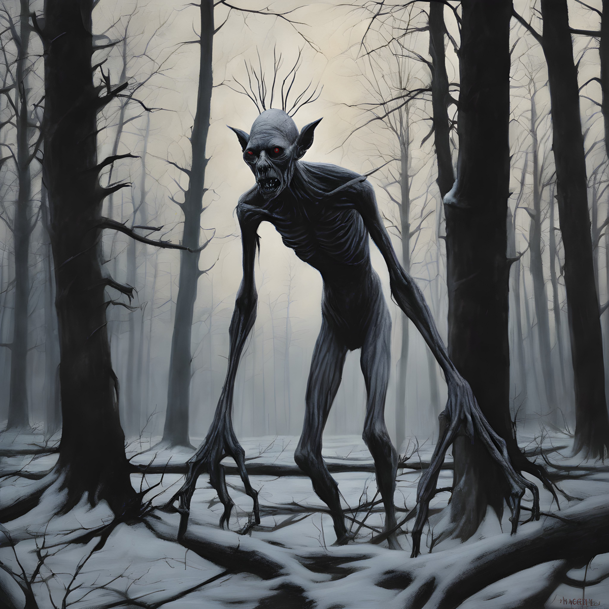 The creature is often depicted as being extremely thin, almost skeletal, adding to its horrifying visage.